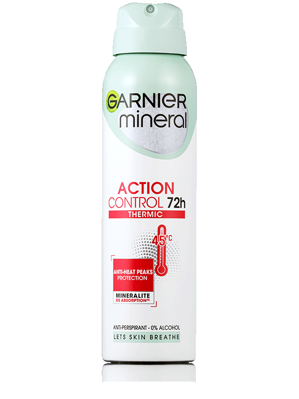 Garnier MINERAL ACTION CONTROL THERMIC 72h je antiperspirant pro maximální až 72h účinnost při vysokých teplotách. Obohaceno o přírodní minerál Mineralite. Má až 72h účinnost proti pachu, testováno v prostředí sauny (45°C). Rychleschnoucí, pro dlouhotrvající pocit suché pokožky.